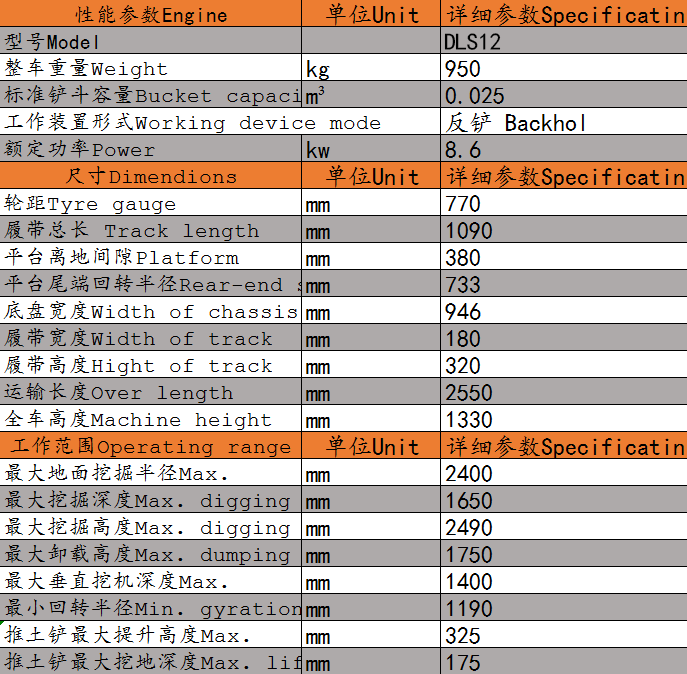 DLS12微型履帶挖掘機參數(shù)