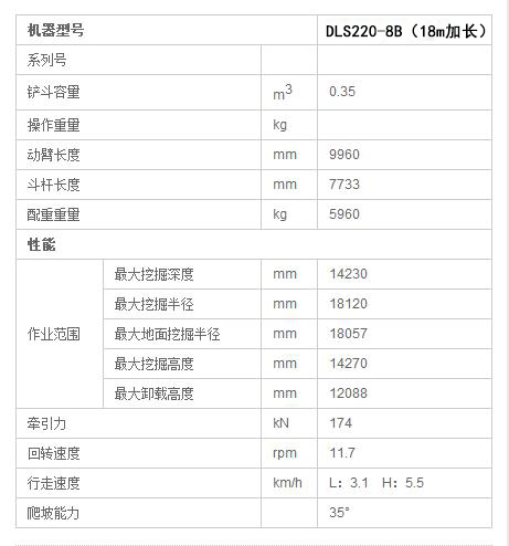 DLS220-8B加長臂挖掘機鏟斗容量0.35立方米,工作裝置長度18米,大大擴大了挖掘的活動范圍,達到的范圍更高、更深、更遠,特別適應礦山、碼頭、倉儲、抗洪搶險及特殊的場合作業,是挖掘機械的一大突破性改造,具有極大的實用價值?!?