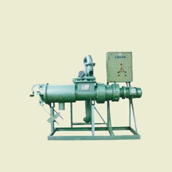 螺旋擠壓式固液分離機主要由主機、無堵塞泵、控制柜、管道等設備 組成。主機有機體、網篩、擠壓絞龍、振動電機、減速電機、配重、 卸料 裝置的部位組成。 其工作過程如下:無堵塞泵將未經發酵的豬糞水泵入機體,在振動電機的作用下加速落料,此時經動力傳動,擠壓絞龍將糞水逐漸推向機體前方,同時不斷提高前緣的壓力,迫使物料中的水分在擠壓帶濾的作用下擠出網篩,流出排水管。擠壓機的工作是連續的,其物料不斷泵入機體,前緣的壓力不斷增大,當大到一定程度時,就將卸料口頂開,擠出擠壓口,達到擠壓出料的目的。為了掌握出料的速度與含水量,可以調節主機下方的配重塊,以達到滿意適當的出料狀態。使用螺旋擠壓式固液分離機,其自動化水平高、操作簡單、易維修、日處理量大、動力消耗 低、適合連續作業。其關鍵部件選用不銹鋼材料制成, 整機重量近半噸且外形尺寸較小,是規?;B豬場理想的固液分離設備,能大幅度提高固液分離與效益。但同時對豬場的排水工藝、環境的特點、貯糞池的容積與結構、排糞溝的落差等諸多因素又有著嚴格的要求。首先對其分離的物料有個起碼的要求,應是未經發酵的糞水,從工藝要求上要修建一個貯存糞水的貯糞池。如果發現待分離的糞水濃度太稀,其固化物含量小于3%的時候,使用擠壓機會大大地降低出料效率。為了提高固液分離的效率,就要求在貯料池前修一個30立方米~40立方米的沉積池,此池略高于貯料池,其池上方留有溢流口,讓較稀的糞水從高位上溢流出去, 其池底會相應沉積得到較濃的物料,此后再進行固液分離就可大大提高出料速度了。