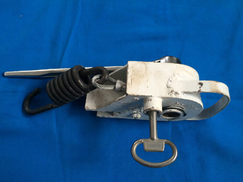 新型開啟定位式鋼絲繩防溜器是我公司研制的專利產品,是在鐵路車輛防溜存在著斷繩、夾繩、鋼絲繩頻繁彎曲,過早疲勞斷裂及維修難,開啟不定位,操作困難,無法更換鋼絲繩等現象、設計出一種新型拉簧式鋼絲繩防溜器。一、新型開啟定位式鋼絲繩防溜器具有以下優點: